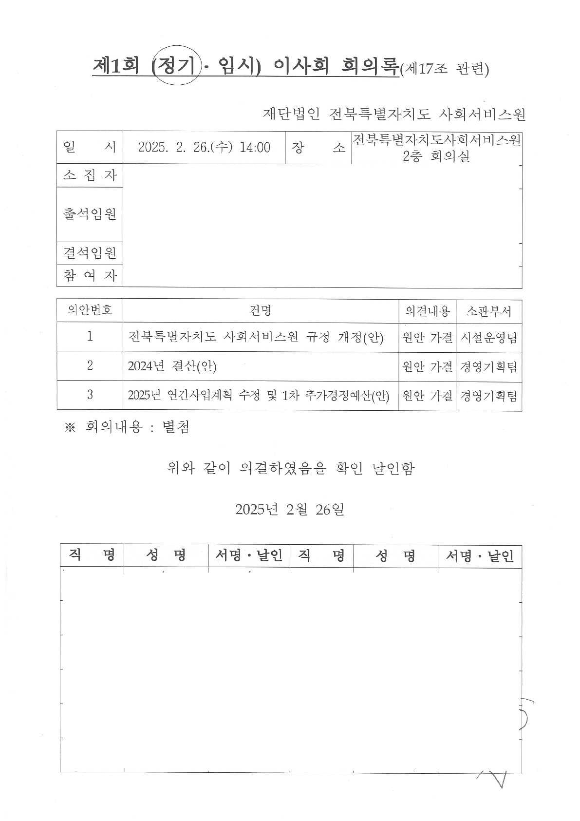 2025년 전북특별자치도사회서비스원 1차 이사회 의사록을 붙임과 같이 공개합니다.