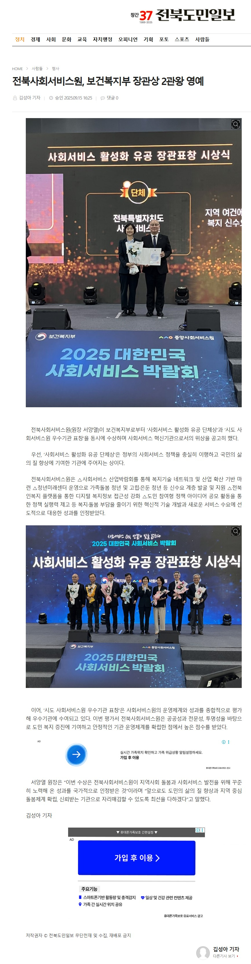 [2025-09-15] 전북사회서비스원, 보건복지부 장관상 2관왕 영예