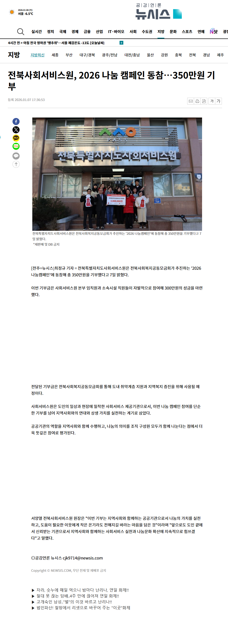 [2026-01-07] 전북사회서비스원, 2026 나눔 캠페인 동참... 350만원 기부