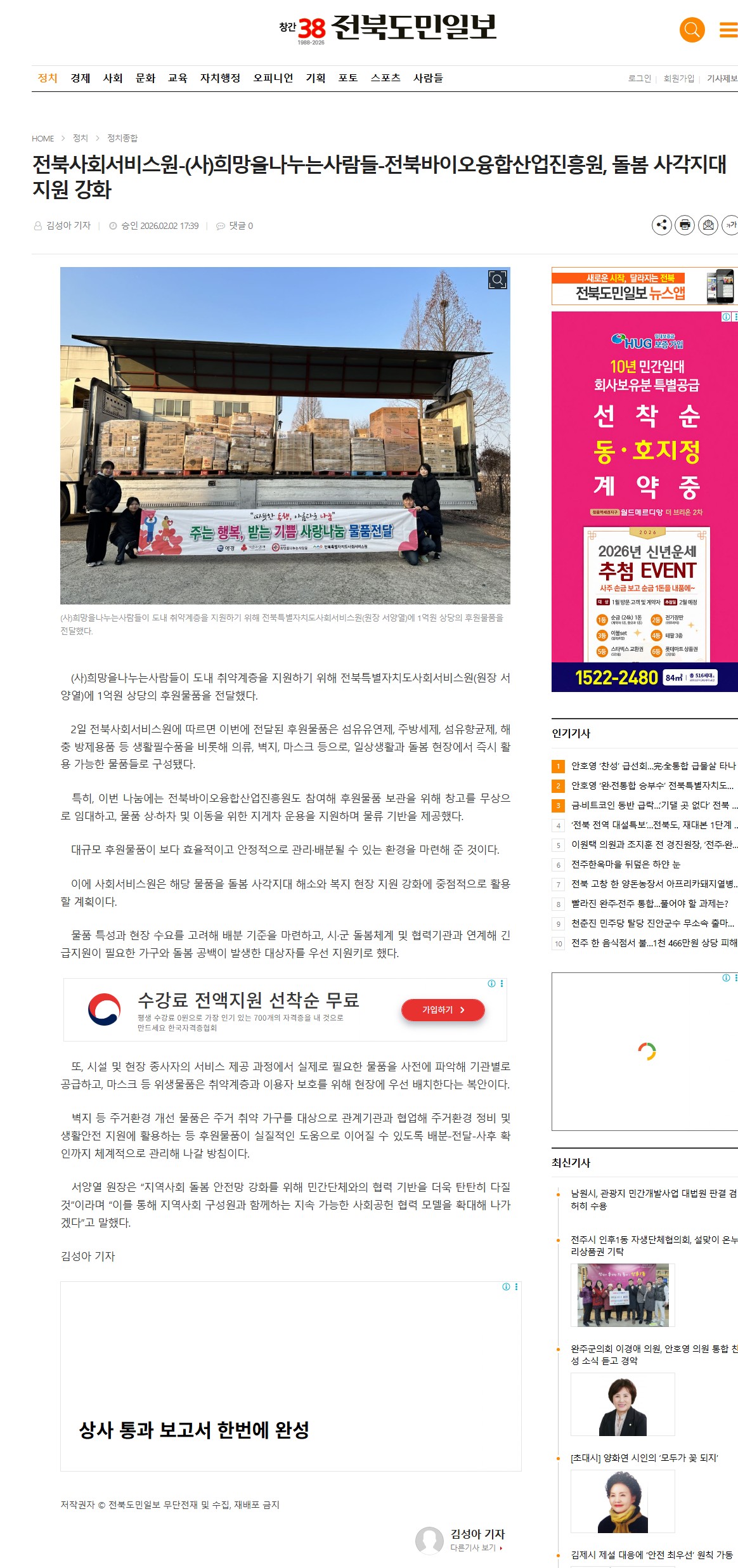 [2026-02-02] 전북사회서비스원-(사)희망을나누는사람들-전북바이오융합진흥원, 돌봄 사각지대 지원 강화