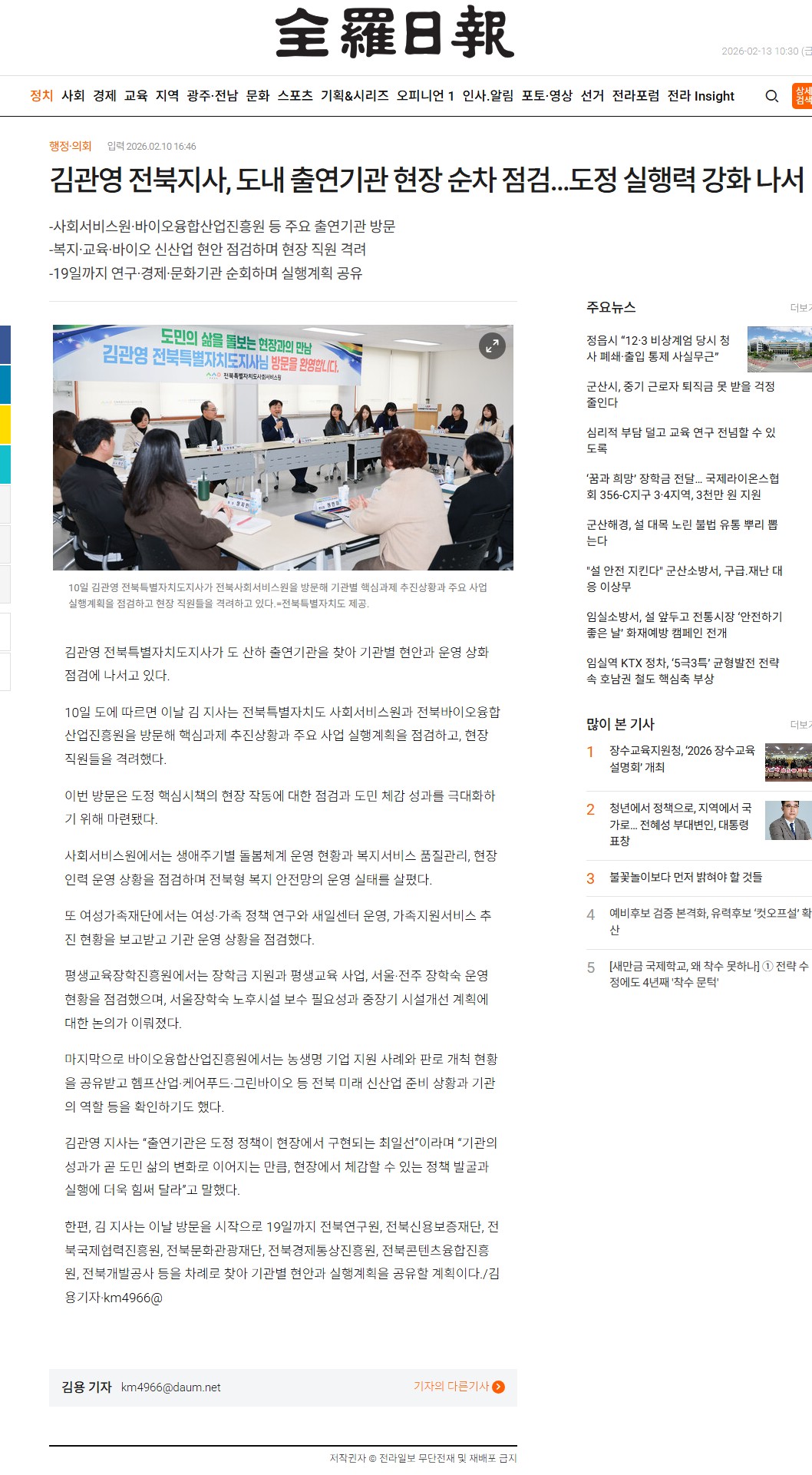 [2026-02-10] 김관영 전북지사, 도내 출연기관 현장 순차 점검... 도정 실행력 강화 나서